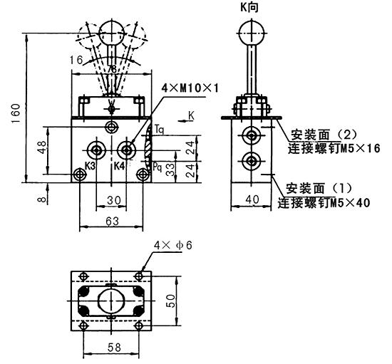 用途與特征: 2KQF型操縱氣閥是切換多路氣控閥氣缸的操縱氣閥。搬動(dòng)手柄可在二個(gè)不同位置分別控制多路閥工作。具有其重量輕,體積小,對(duì)環(huán)境無(wú)污染,靈敏度高得多等優(yōu)點(diǎn)。是5噸位以上自卸汽車氣路控制的一種理想元件。2KQF型操縱氣閥的原始位置Pq口與T口是封閉的,各控制口K與Tq口相通。搬動(dòng)手柄可在二個(gè)不同角度。