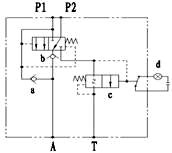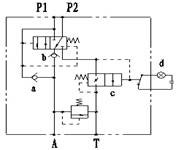 3.當(dāng)轉(zhuǎn)向液壓系統(tǒng)助力泵出現(xiàn)故障或在行駛過程中發(fā)動(dòng)機(jī)突然停止工作時(shí),無(wú)轉(zhuǎn)向壓力油從P1口進(jìn)入應(yīng)急閥。這時(shí)應(yīng)急閥主閥芯在彈簧力作用下復(fù)位,主閥芯和背壓閥c同時(shí)關(guān)閉;瞬間則由應(yīng)急泵提供壓力油通過單向閥b(此時(shí)單向閥a關(guān)閉)分配到A口,壓力油經(jīng)P2→b→A口流出進(jìn)入液壓轉(zhuǎn)向器的分配閥使其正常工作,驅(qū)動(dòng)液壓轉(zhuǎn)向器的活塞運(yùn)動(dòng)從而達(dá)到應(yīng)急轉(zhuǎn)向的目的。