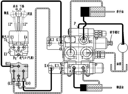 舉升泵供油進(jìn)入QDF-L20型氣控多路閥后,通過操作氣控操作閥不同位置,讓壓縮空氣分別進(jìn)入該閥所帶氣缸,當(dāng)推動(dòng)舉升閥閥芯時(shí),可實(shí)現(xiàn)車箱舉升、中停、下降等功能;當(dāng)推動(dòng)換向閥閥芯時(shí),可實(shí)現(xiàn)車箱頂蓋開啟、閉合等功能。