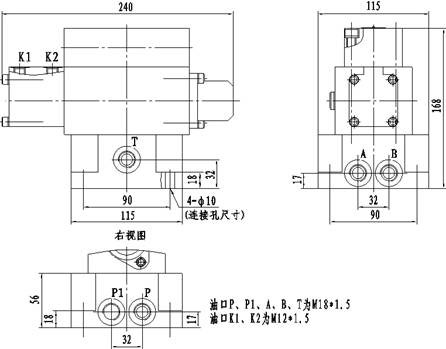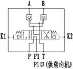 QDZ9114型氣控閥組在中位時(shí),P口與P1口相通,壓力油由P口進(jìn)入,經(jīng)過(guò)P1口可向其它機(jī)構(gòu)提供油源。當(dāng)壓縮空氣進(jìn)入K1口或K2口時(shí),該閥處于換向位置,壓力油由P口經(jīng)過(guò)A口(或B口)進(jìn)入油缸的一腔,油缸另一腔的油液由B口(或A口)經(jīng)過(guò)T口回油箱,控制油缸的伸縮;當(dāng)切斷進(jìn)入該閥的壓縮空氣時(shí),閥芯在彈簧力的作用下回到中位,雙向液控單向閥(液壓鎖)關(guān)閉,鎖定油缸的伸縮。該閥的工作原理示意圖如下: