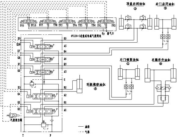 工作泵(舉升泵)供油進入QSF-L20H型組合換向閥后,通過氣控(手動)操作換向閥切換油路,實現(xiàn)對不同執(zhí)行元件(油缸)的控制。當執(zhí)行元件(油缸)需要大流量的液壓油進行工作時,用油管與該組合閥中進油閥體與分流閥體之間的換向閥體進行連接,工作泵(舉升泵)輸出的液壓油將全流量通過換向閥進入執(zhí)行機構(gòu)(油缸);當執(zhí)行元件(油缸)需要小流量的液壓油進行工作時,用油管與該組合閥中分流閥體后面的換向閥體進行連接,工作泵(舉升泵)輸入的液壓油經(jīng)分流閥后分流出一部分(30L/Min)通過換向閥進入執(zhí)行機構(gòu)(油缸),剩余的液壓油直接流回油箱。