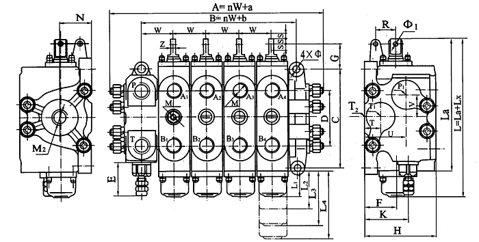 ZL型多路閥的外形及安裝連接尺寸: