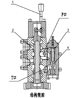 2、主閥的方向切換及節(jié)流原理,當(dāng)手柄(序1)處于中間位置時(shí)工作油口(A、B口)封閉,從油泵排出的油液從P口回到T口卸荷,油馬達(dá)停止。當(dāng)手柄處于右側(cè)時(shí),主閥芯(序2)向上移動(dòng),從P口流入的油液通過節(jié)流口流到A口,再?gòu)腁口流出驅(qū)使油馬達(dá)轉(zhuǎn)動(dòng),經(jīng)過油馬達(dá)后的油液從B口回到T口,這樣靠手柄板動(dòng)不同的傾斜角度,使主閥芯處于不同的位置來調(diào)節(jié)節(jié)流口的開度大小,以達(dá)到油馬達(dá)的轉(zhuǎn)速調(diào)節(jié)。