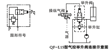 QJF-E15(20)L型氣控舉升閥的原始位置P口與T口是連通的(常開式結構)。該閥工作時,利用壓縮空氣通過氣缸推動閥芯封閉,油路由常通位置轉(zhuǎn)為工作位置,即實現(xiàn)車廂的舉升;切斷氣源P口與T口接通油液流入油箱,系統(tǒng)卸荷車廂下降。