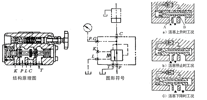 RBG-03先導(dǎo)式平衡閥的主閥為滑閥式結(jié)構(gòu)。圖a)為缸上升的情況,當(dāng)C口的壓力未達(dá)到設(shè)定的壓力時(shí),滑閥在彈簧力的作用下處于圖示位置,閥口A開(kāi)啟,壓力油由P口至C口,活塞上升。圖b)為活塞停止時(shí)的情況,當(dāng)C口壓力達(dá)到設(shè)定壓力后,導(dǎo)閥開(kāi)啟,滑閥上的節(jié)流孔使滑閥兩端產(chǎn)生壓差,滑閥左移減壓,直至閥口A關(guān)閉;若泄漏使C口壓力下降,則滑閥右移,P口向C口供油,從而使C口壓力恒定,達(dá)到平衡目的.圖c)為活塞下降的情況,當(dāng)缸加上外負(fù)載,C口的壓力大于設(shè)定壓力時(shí),滑閥兩端的壓差增大,滑閥左移到圖示位置,閥口B打開(kāi),油液由C口流向T口。從遙控口K接遠(yuǎn)程調(diào)壓閥,可對(duì)C口的設(shè)定壓力進(jìn)行遠(yuǎn)控。