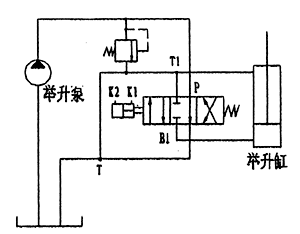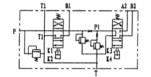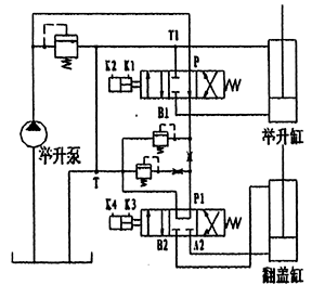 當(dāng)氣控多路閥處于中間位置時,使車廂舉升位置保持不變,同時系統(tǒng)壓力油供另一組帶附加功能(翻蓋功能)的閥片工作即可實現(xiàn)車廂翻蓋的閉合—展開功能。該閥的工作原理示意圖如下
