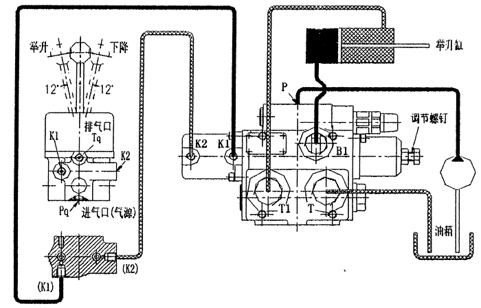 該閥先導(dǎo)控制部分以壓縮空氣為工作介質(zhì),通過氣缸動作推動閥芯開閉而轉(zhuǎn)換工作機能,即實現(xiàn)車廂的舉升—中!陆档裙δ堋
