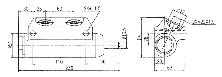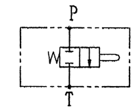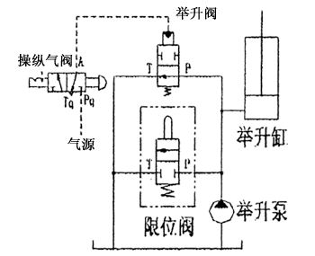 當車廂舉升轉角達到一定角度時,舉升缸或其它限位機具觸及限位閥閥桿,閥內P口與T口接通系統卸荷,切斷向舉升缸供油,車廂停止舉升,實現限位功能起舉升限位作限用。當車廂舉升到最大轉角位置時,限位機構將限位閥的限位桿壓下P口與T口接通,使舉升缸供油口與T口瞬間連通,舉升缸即下降一段距離(車廂舉升轉角變小),隨車廂舉升轉角變小限位閥的限位桿恢復原始狀態(tài)同時系統壓力油再次進入舉升缸使其上升(車廂再次舉升到最大轉角位置)。在限位閥的限位桿行程范圍內(即P口的開啟—閉合—開啟)現車廂下降—舉升—下降往復變化過程,使車廂產生輕微抖動有利于將車廂內的殘留物體卸掉。該閥的工作原理示意圖如下。