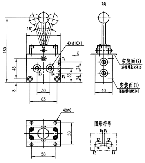 4(2)KQF型操縱氣閥的原始位置Pq口與T口是封閉的,各控制口K與TQ口相通。搬動(dòng)手柄可在四個(gè)或二個(gè)不同角度。該閥的工作原理示意圖如下